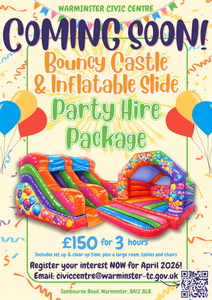 Our brand new Bouncy Castle & Inflatable Slide Party Hire Package is launching at Warminster Civic Centre and will be available to book from April 2026.